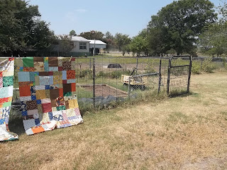 On my days off I had decided to tackle a few UFO's. I ended up with 3 tops, watched the cooking channel and stayed indoors. It's 105 F today. My lawn is suffering because we don't water. Our drought continues on. It didn's stop Billy the Kid from rolling in the sand to cool off. Now, to get them quilted...have a great week, Elaine